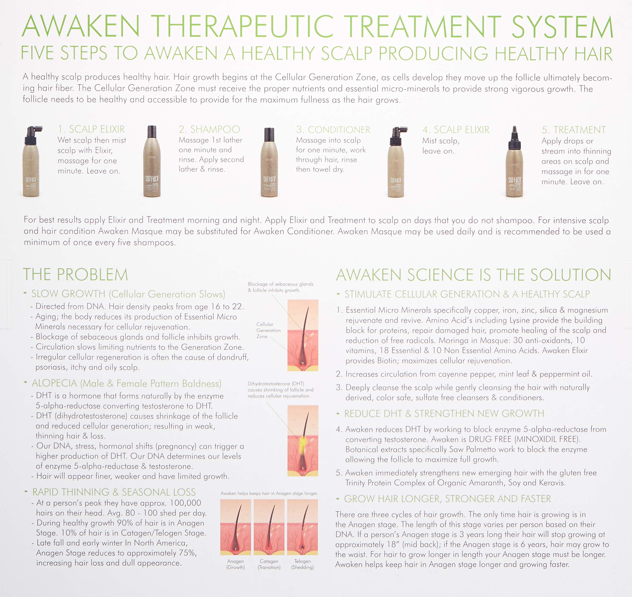 Awaken Therapeutic Kit includes Awaken Therapeutic Shampoo 10 oz. Surface Awaken Remedial Treatment encourages a steady scalp as well as stimulates hair development. This application rejuvenates healthy scalp and hair by using DHT-blocking phytonutrients.